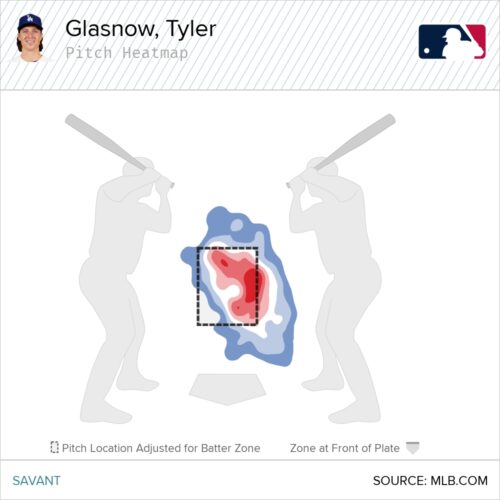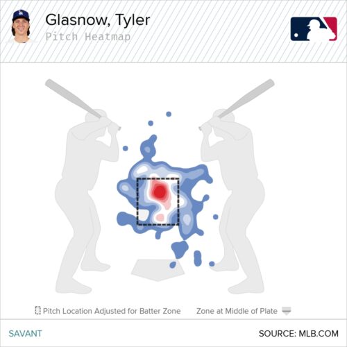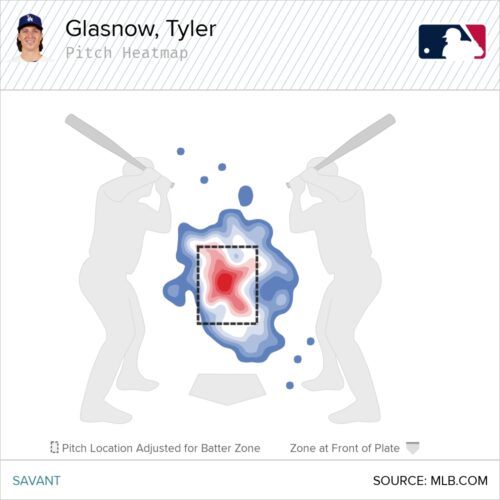 Glasnow also has a somewhat abnormal average launch angle of 18 degrees on his sinker. That has increased the last three seasons from 4 degrees in 2024 and 15 degrees last season. Here’s what it looks like on the pitch heatmap.